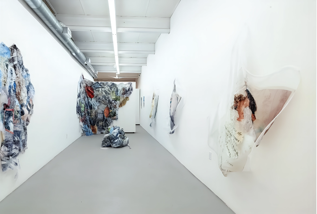 In the solo exhibition Everything I Forgot?, Lisu Vega (b. Miami, 1980) explores her childhood and family memories, blending her artistic roots in experimental printmaking, textile techniques, and image sublimation. The project, presented at Edges Zone in September 2024, included textile installations with photographic interventions that reconstruct scenes linked to the artist’s early biography. For Vega, memory is a volatile entity that tends to fade. Faces and places blur, much like the sublimated images embedded in the fibers of her textile works. The exhibition is accompanied by short phrases and a text by semiologist Víctor Fuenmayor, a deep connoisseur of the artist’s work since her beginnings in Maracaibo, Venezuela, where she spent her childhood and trained. The recovered memory takes on the appearance of amorphous bodies and surfaces, expanding like a spider web or, perhaps, like the buried roots of plants that offer shade.